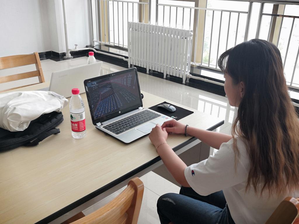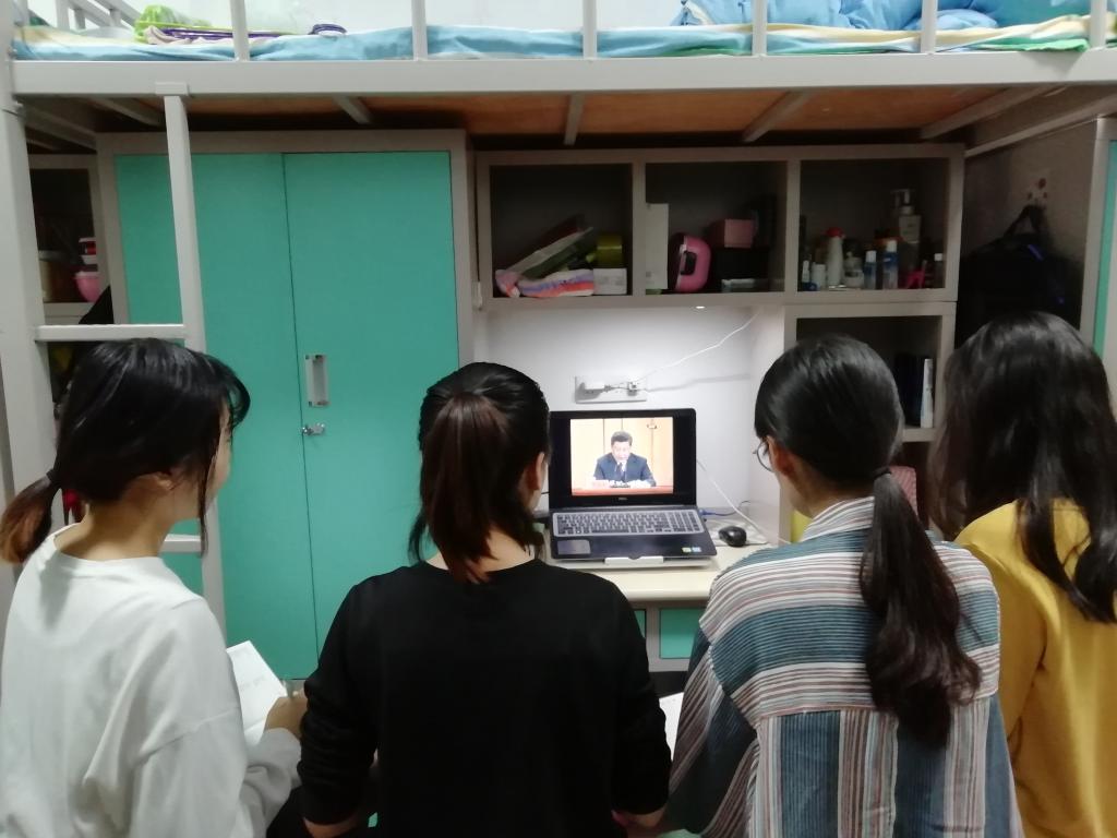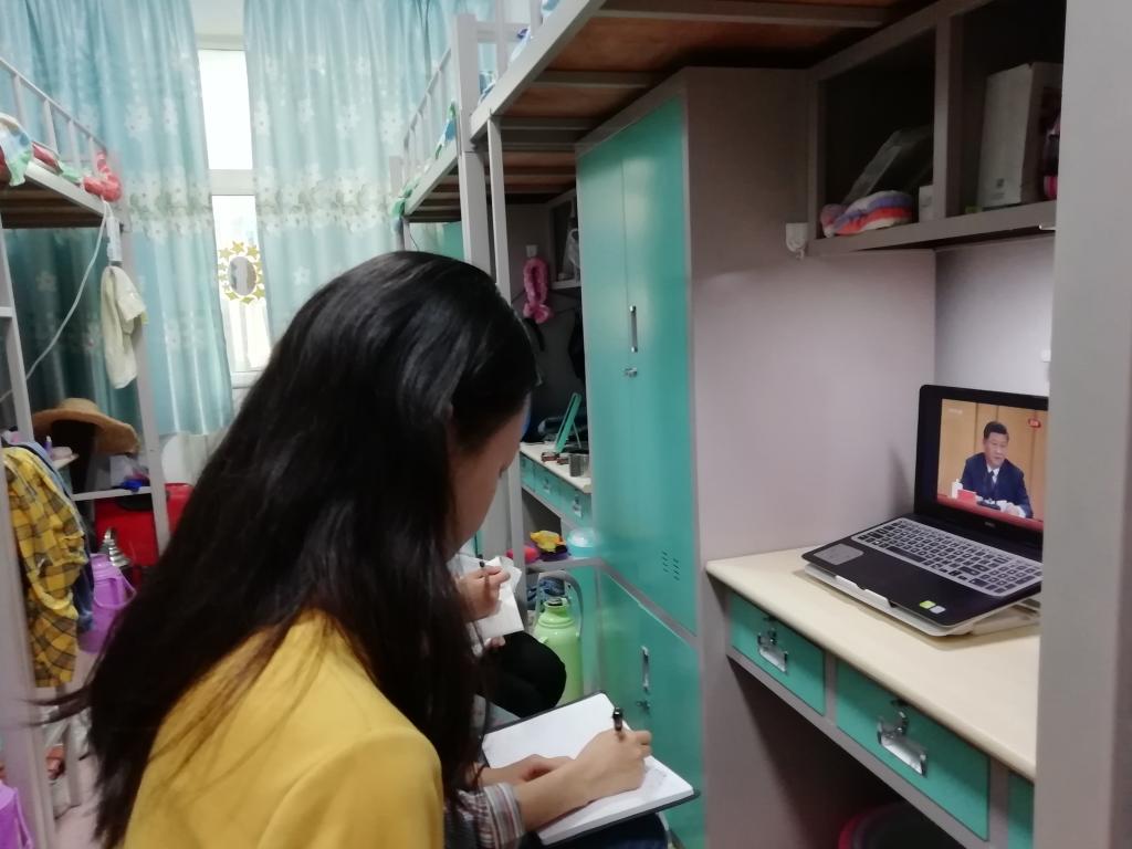 水产草科学生党支部寇春妮,早早起床开始调试电脑,一边收看大会直播,一边认真记笔记。她说:“宿舍网络用的人比较多,我必须得提前打开网页,才可以跟上直播的速度。”