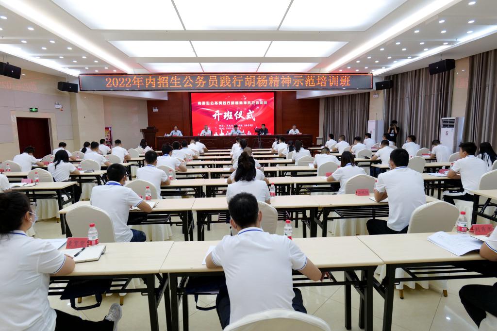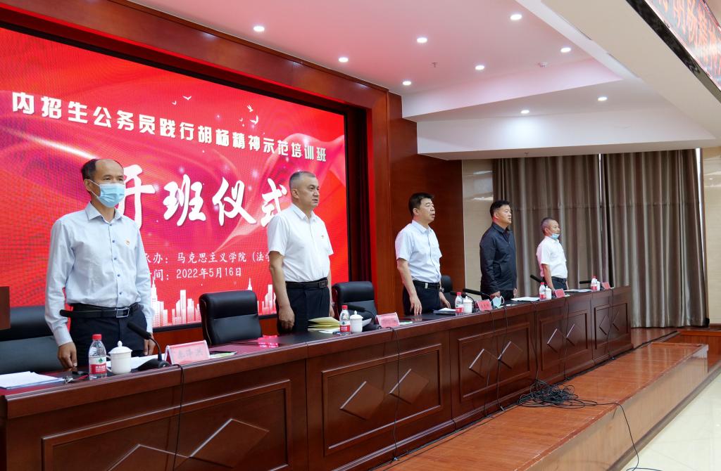 5月16日上午,随着雄壮的奏唱国歌声,2022年内招生公务员践行胡杨精神示范培训班在我校开班。党委书记赵光辉出席并讲话。党委组织部、胡杨学院、马克思主义学院(法学院)领导、教师代表和来自南疆各团场的49名学员共同参加。开班式由党委组织部常务副部长张伟信主持,在胡杨干部培训中心二楼报告厅举行。