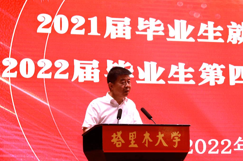 赵光辉代表学校党委向过去一年为学校毕业生就业工作付出努力、付出心血、取得成绩的各级干部、辅导员、班主任和广大教师表示衷心的感谢。他指出,当前,疫情防控形势复杂多变,稳就业是对学校立德树人根本任务成效的一次检验,也是对学校的一次大考。一要提高认识,认清形势,增强做好毕业生就业创业工作的责任感和紧迫感。站在讲政治的高度“稳就业”,站在促民生的全局“稳就业”,站在学校事业发展的大局“稳就业”。二要明确目标,突出重点,多措并举,积极推进毕业生更高质量和更充分就业。用好政策、抓住机遇,多措并举、精准指导,访企拓岗,邀企纳贤。三要认清形势,转变观念,提升能力,积极推进全员就业。优化指导服务、提升就业能力,用胡杨精神激励毕业生扎根边疆。他强调,各有关部门各学院要勇于担当、狠抓落实,扛起肩负的职责和使命,进一步落实就业工作‘一把手工程’,优化创新供需对接方式,加强就业信息高效服务,拓宽校园招聘主渠道,帮助毕业生解决实际困难,以时不我待的紧迫感和责任感,全力以赴确保2022届毕业生毕业去向落实率达到既定目标,以优异的成绩迎接党的二十大的胜利召开。”