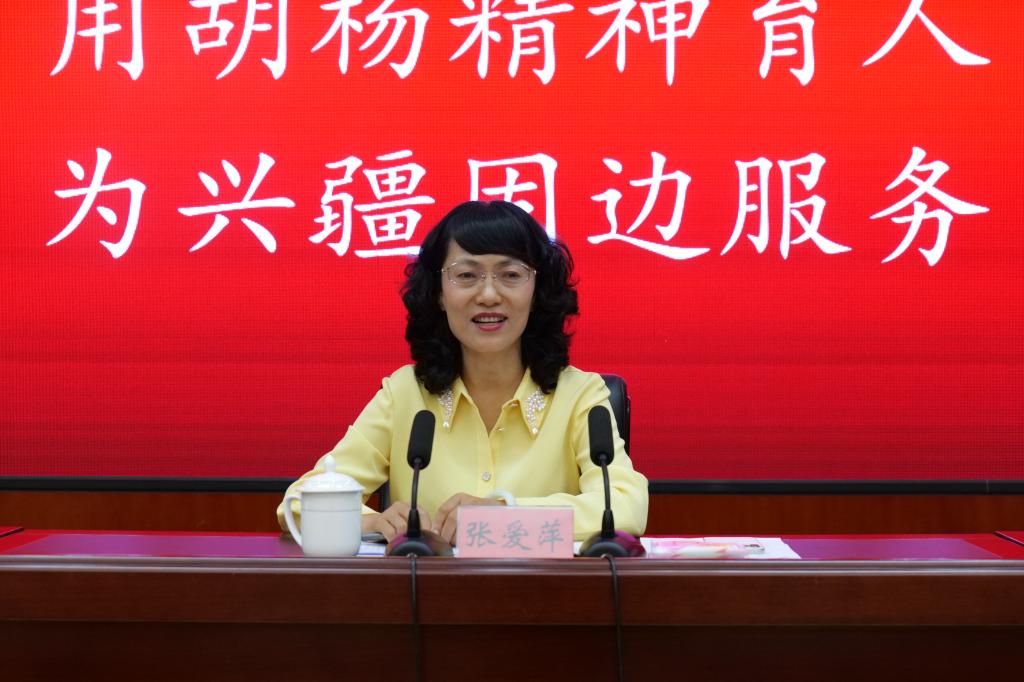 张爱萍致辞,代表学校党委欢迎兵团乡村振兴工作战线同仁齐聚塔大,感谢兵团党委、兵团农业农村局对塔里木大学事业发展的关注支持、对承办此次研讨班的信任与厚爱,感谢大家为兵团农业农村工作作出的贡献、付出的努力,介绍了塔里木大学的办学历史和辉煌成就,强调了此次研讨班的重要意义。她指出,此次研讨班是贯彻习近平总书记关于“三农”工作重要讲话和指示批示精神的具体实践,也是贯彻新时代党的治疆方略,促进兵团农业现代化发展,推进兵团先进生产力和先进文化示范区建设的具体体现。希望以此次研讨班为契机,在兵团党委的大力支持下,共同携手、勠力同心,把论文写在兵团和南疆大地上,让科技长在泥土里,把服务送到老百姓的心坎上,全力以赴做好产业、人才、文化全方位乡村振兴,让乡村振兴在南疆、兵团开花结果,为履行新时代兵团维稳戍边职责使命,高质量推进现代化建设,实现新疆社会稳定和长治久安作出兵团人的新贡献。