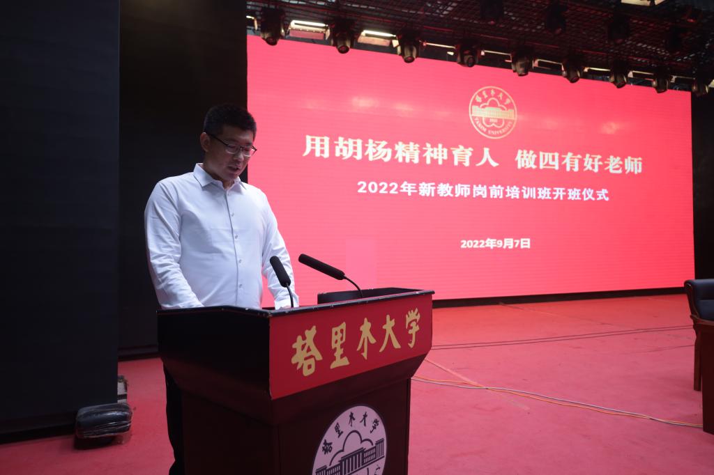用胡杨精神育人,做四有好老师。9月7日上午,在雄壮的奏唱国歌声中,塔里木大学2022年新教师岗前培训班开班。党委书记赵光辉,党委常委、副校长赵峰华、于军出席开班仪式。各学院、有关部门主要负责同志,以及2020-2022年入职教职工参加。开班式由于军主持,在行政楼B座报告厅举行。