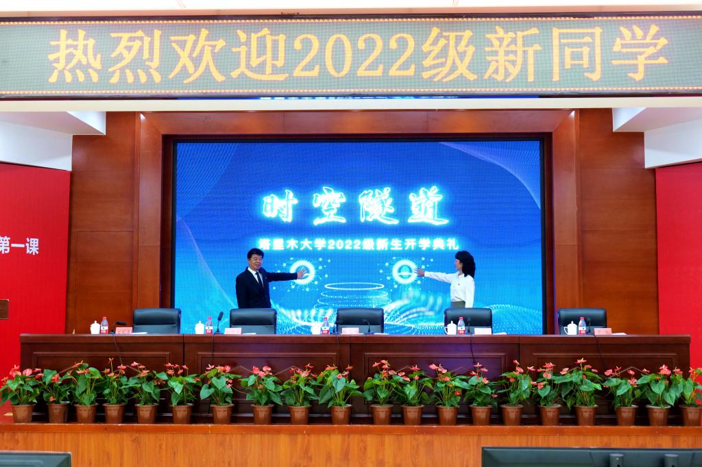 上午10:00,伴随着雄壮的奏唱国歌声,塔里木大学2022级新生开学典礼暨开学第一课拉开序幕。党委书记赵光辉,党委副书记、校长张爱萍共同开启时空隧道。广大新同学及家长们跟随着镜头画面,穿越时空隧道,云游塔大校园,共迎开学典礼。