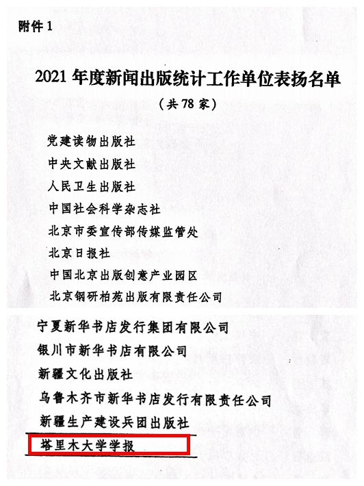 近日,中共中央宣传部印发《中央宣传部办公厅关于表扬2021年度新闻出版统计工作单位、个人的通知》(中宣办发函〔2022〕923号),对全国从事新闻出版统计工作的78家单位和111名工作人员予以通报表扬。塔里木大学学报因在2021年度全国新闻出版统计工作中认真履行职责,高质量地完成了各项新闻出版统计工作,受到本次中共中央宣传部办公厅的通报表扬。