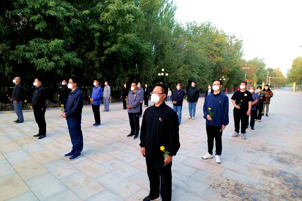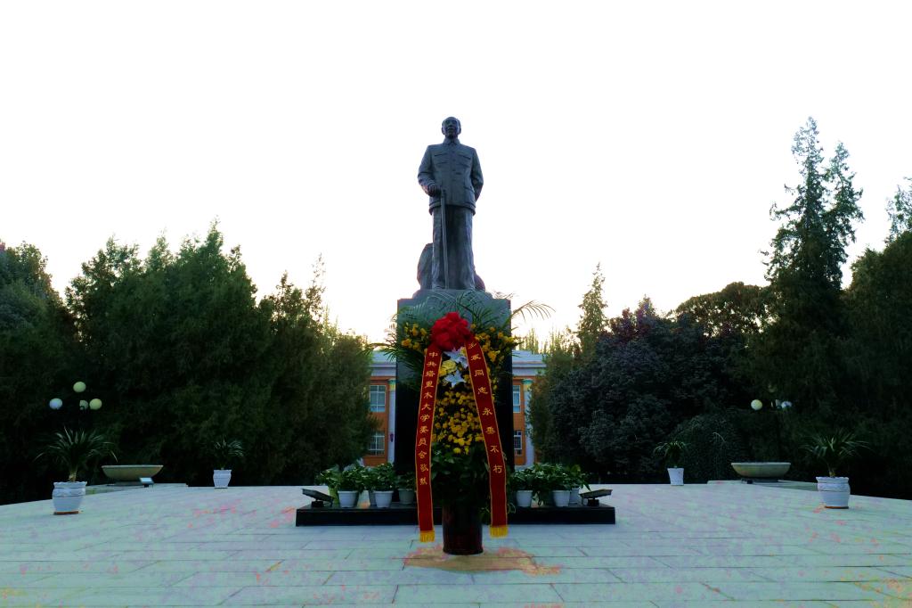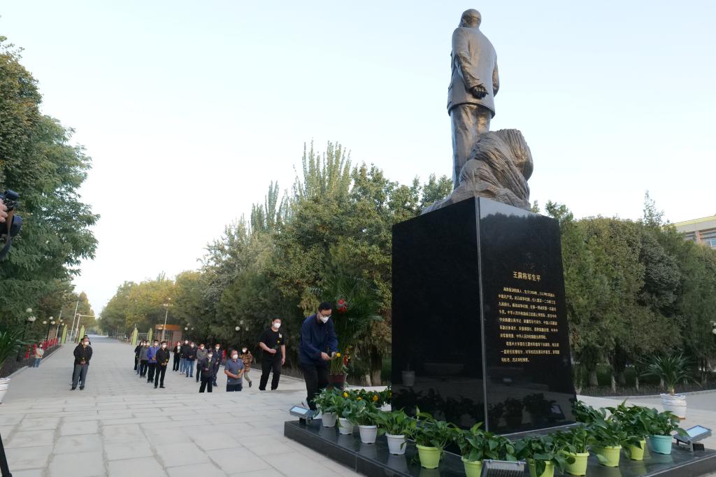 英雄不朽,精神永存。胡杨苍翠、翠柏颔首。王震将军铜像巍然屹立在红色文化广场中央,基座周围花坛上镶嵌着白菊、百合、黄菊等鲜花组成的花环,寄托着全体塔大党员干部和师生员工对革命先辈的无限追思。