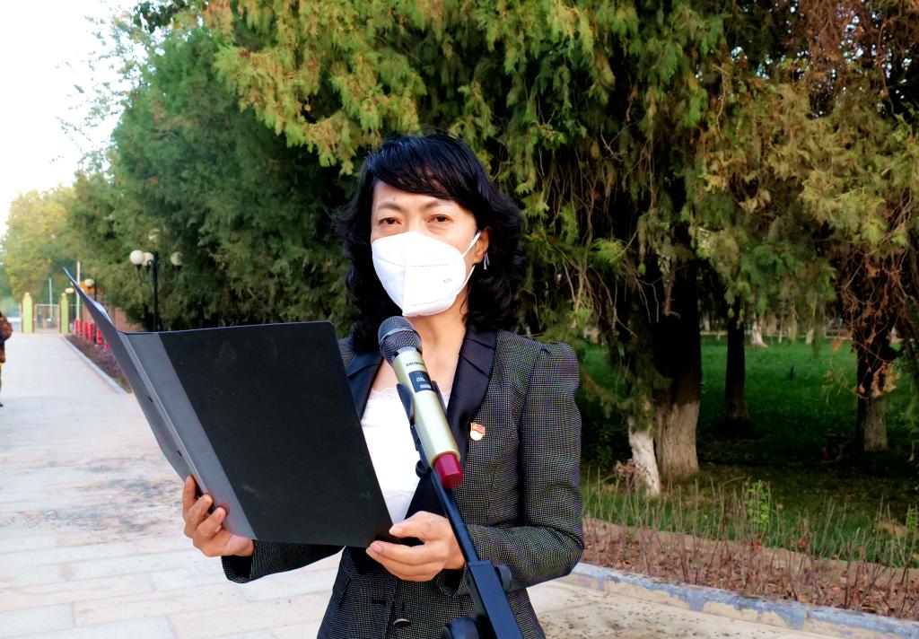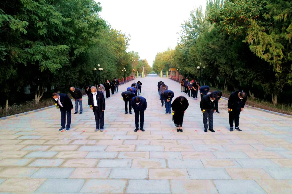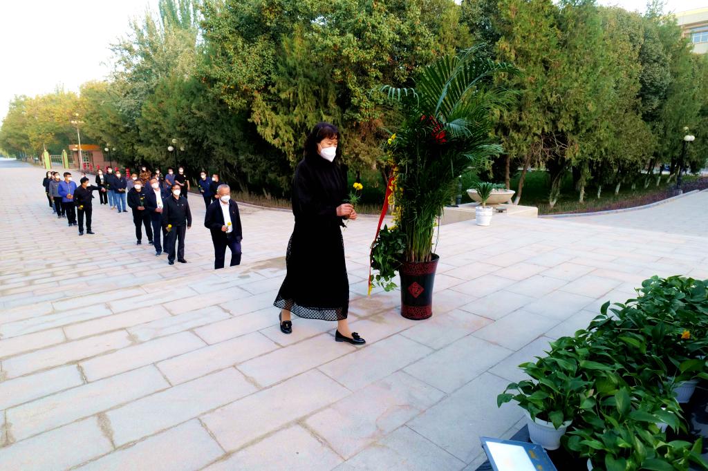先辈的功勋彪炳史册,英雄的丰功流芳千秋。今天,党员干部和师生代表在此庄严集会,举行“缅怀革命先烈 赓续红色血脉”向王震将军铜像敬献花篮仪式,就是要崇尚英雄、缅怀先烈,赓续红色血脉,弘扬伟大建党精神,践行胡杨精神,坚守为党育人、为国育才的初心,坚持用胡杨精神育人、为兴疆固边服务,为忠诚履行新时代兵团维稳戍边职责使命、努力建设新时代美好新疆,不断作出新的更大贡献,以优异成绩迎接党的二十大胜利召开。