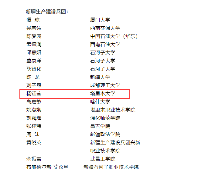 日前,共青团中央公布了2021年度“中国大学生自强之星”奖学金推报活动结果,全国共推报“中国大学生自强之星标兵”奖学金获得者10名,“中国大学生自强之星”奖学金获得者1832名。我校化学化工学院化学工程与工业生物工程2019级杨钰莹、水利与建筑工程学院给排水科学与工程2021级玉苏普·卡依尔2位同学位列其中,荣获2021年度“中国大学生自强之星”奖学金。