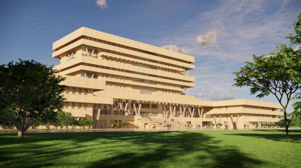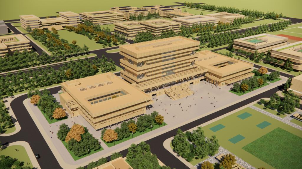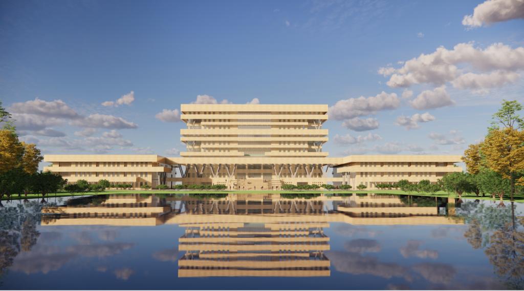 主体结构功能为电子图书馆、共享办公、工科基础公共教室及实验室。采用方正规整的建筑布局形式,简洁实用,以“质朴”为建筑整体风格的底色,结合适应当地气候特征的结构遮阳构件的设置,整体建筑与南疆这种地域辽阔、大山大川大漠的水平延展气度相互呼应,相互融合,体现了塔大“沙漠学府”及“胡杨精神”的朴素与坚韧。