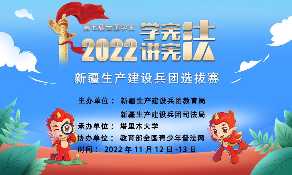 第七届全国学生“学宪法 讲宪法”活动新疆生产建设兵团选拔赛即将于2022年11月12日16:00在塔里木大学开赛,敬请关注。