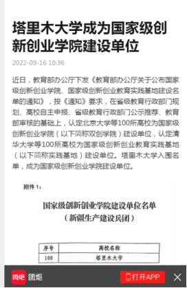 2022年9月13日,《教育部办公厅关于公布国家级创新创业学院、国家级创新创业教育实践基地建设名单的通知》公布,我校获批国家级创新创业学院建设单位,新疆和兵团共有2所高校入围建设名单。学校坚定不移实施特色办校战略,强化为党育人,为国育才导向,聚焦服务兵团职责使命,突显精准对接优势,构建特色人才培养体系,培养新时代戍边人。办学规模稳步扩大,2022年招生本科、研究生7945人,其中普通疆外生源5000余人。强化就业服务工作,2022届本专科毕业生共有4495人,截至目前,毕业去向落实率为90.96%。人才培养模式改革不断深化,人才培养质量不断提高。成立机器人产业学院和ICT产业学院,学分制人才培养方案进一步完善。深入开展教育教学研究,申报立项校级教学改革与研究项目59项。创新创业教育提质增效,获批教育部首批产学合作协同育人项目12项,另有3个项目入选教育部第二批建设试点名单。参加学科竞赛获得国家级奖项134项、省部级奖项501项。承办第八届兵团互联网+大学生创新创业大赛并荣获各类奖项34项。立项大学生创新创业训练计划项目国家级70项、校级251项。学校位列“全国普通高校大学生竞赛六轮总榜单(本科,TOP300)”第239名。学生社会实践能力不断强化,组织418支团队3700多名师生深入南疆基层开展社会实践,荣获国家级“三下乡”荣誉4个、兵团级荣誉27个。“点沙成金—设施番茄高效黄沙无土栽培”项目荣获第五届中国青年志愿服务公益创业赛银奖。“塔里木渔业保护和生态修复志愿服务项目”“小胡杨教育帮扶团”荣获第六届中国青年志愿服务项目大赛铜奖。