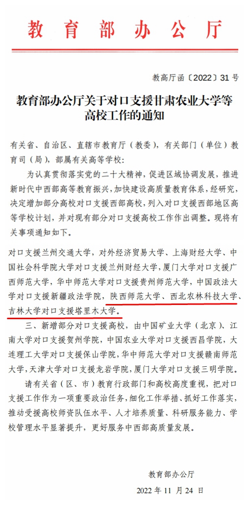 2022年11月24日,《教育部办公厅关于对口支援甘肃农业大学等高校工作的通知》发布,塔里木大学新增陕西师范大学、西北农林科技大学、吉林大学三所对口支援高校。学校坚定不移走开放办学之路,持续拓展深化以对口支援为重点的国内交流合作,积极构建国际交流合作新格局,服务南疆的使命共同体进一步扩大。深入推进对口支援工作,召开教育部高校团队对口支援塔里木大学十周年总结表彰暨新一轮对口支援框架协议签约大会、教育部高校团队对口支援塔里木大学2022年工作例会,与团队对口支援高校签署新一轮对口支援协议。深化国际交流与合作,获批国家留学基金委“高级访问学者项目”1人、兵团科技局“一带一路”创新人才交流外国专家项目1项,参加“一带一路”/南南合作农业教育科技创新联盟第五届年会、“上合组织成员国涉农高校联盟”首届上合组织国家农业大学校长论坛活动并作主旨报告。深化兵地共建、兵地融合发展,构建服务南疆发展使命共同体,全力支持南疆师团规划建设和力量布局,在人口、人心、人才三个关键问题上精准发力,充分发挥教育聚人的特殊作用。