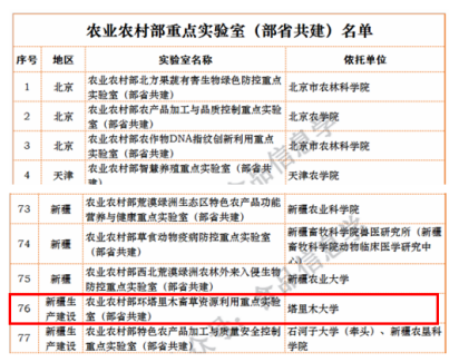 2022年9月13日,农业农村部办公厅公布《农业农村部办公厅关于印发农业农村部重点实验室(部省共建)名单的通知》,塔里木大学环塔里木畜草资源利用重点实验室获批农业农村部重点实验室(部省共建)。学校加强科研平台建设,积极推进“塔里木盆地生物资源保护利用省部共建国家重点实验室培育基地”升级科技部国家重点实验室。推进“南疆设施农业重点实验室”“南疆干旱区特色作物遗传改良与高效生产重点实验室”“南疆特色农林产物利用与装备重点实验室”“现代纺织材料与技术重点实验室”4个实验室升级为兵团重点实验室,为南疆产业发展提供了有力支撑。科技服务彰显新活力,立足服务南疆地区脱贫攻坚与乡村振兴有效衔接,组建26支团队109名科技特派员,深入南疆23个县市和团场围绕农业等产业方向开展科技服务。支持建设的13个科技小院入选教育部、农业农村部、中国科协“科技小院”,其中与第十四师共建的昆玉“红枣科技小院”荣获中国农技协2022年“最美科技小院”。格明古丽·木哈台荣获农业农村部“2019-2021年度全国农牧渔业丰收奖农业技术推广贡献奖”;李志军、张锐荣获兵团“最美科技工作者”;西域文化博物馆、历史与哲学学院、机械电气化工程学院获批全国科普教育基地。