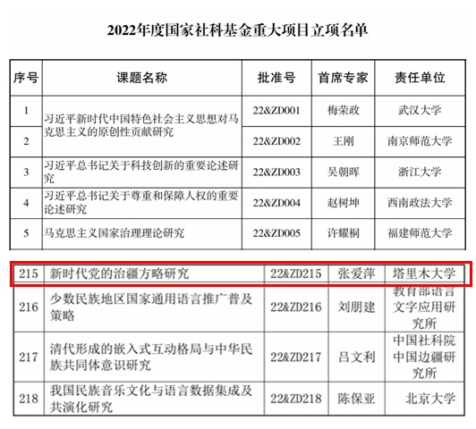 2022年12月,我校党委副书记、校长张爱萍教授主持申报的2022年度国家重大招标项目《新时代党的治疆方略研究》获批立项。这是塔里木大学建校以来首个独立申报获批的国家社科基金重大项目。此次全国共立项338项,新疆获批2项。学校坚持科技是第一生产力、人才是第一资源、创新是第一动力,深入实施科教兴国战略,聚焦南疆重大科技需求,调整科研主攻方向,服务南疆一产上水平、二产抓重点、三产大发展,开辟发展新领域新赛道,不断塑造发展新动能新优势。科研项目实现新突破,申报获批各级各类科研项目415项,立项经费7472.74万元。科技成果质量进一步提升,发表论文1282篇,出版专著11部,制定标准5项,获批专利255项。获2021年兵团科技进步奖各类奖项5项、国家民委社会科学成果三等奖1项。科技成果转化应用加快推进,与山东省技术市场协会联合培养10名中级技术经理人并联合成立“黄河流域科技创新联盟技术经理人专业工作委员会”。挂牌1个技术转移中心企业工作站。转化2项专利,技术合同交易登记4项,签约2项科技成果。