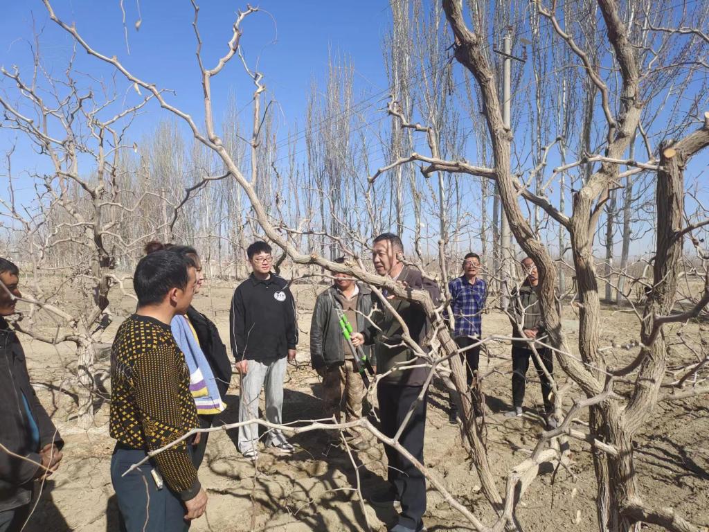 随后,于军来到代尔瓦孜库木村苹果示范园进行调研,并现场开展果树修剪培训,要求工作队充分发挥“访惠聚”工作队优势和学校学科优势,助推代尔瓦孜库木村产业振兴,帮助村民群众增收致富。