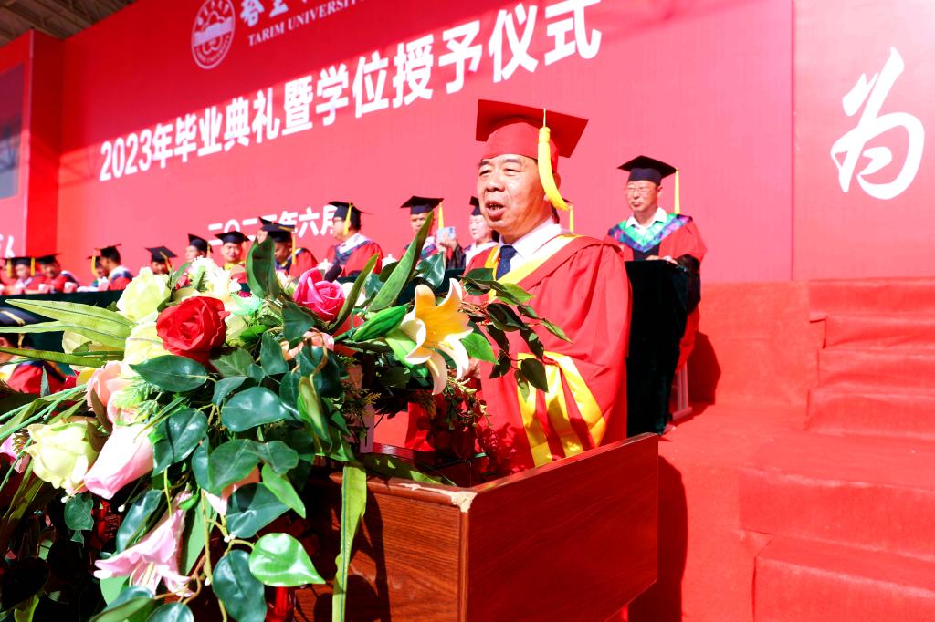 6月16日上午,在塔里木大学2023年毕业典礼暨学位授予仪式上,党委书记赵光辉为毕业生上最后一堂课。