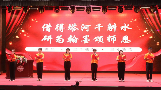“老师,是您指引我们永远听党话、跟党走,是您培育了一批批扎根边疆的小胡杨……”诗朗诵《借得塔河千斛水 研为翰墨颂师恩》,表达了学生们对老师的挚爱,也彰显了塔大教师为党育人、为国育才,用胡杨精神育人、为兴疆固边服务的初心使命。