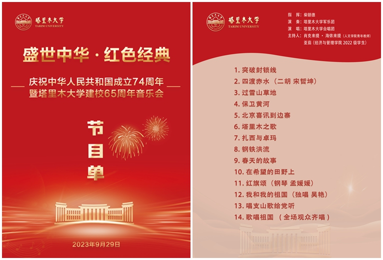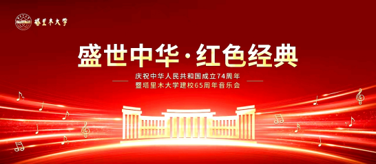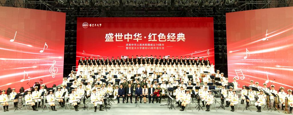 六十五载筚路蓝缕,六十五年风华正茂。在中华人民共和国成立74周年、塔里木大学建校65周年之际,9月29日晚,塔里木大学“盛世中华 红色经典”庆祝中华人民共和国成立74周年暨塔里木大学建校65周年音乐会在新体育馆火热上演。