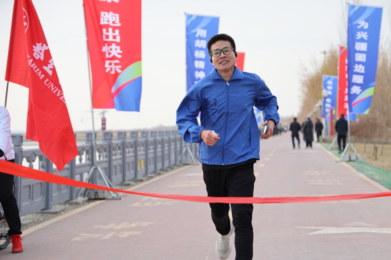 下午三点半,石长青为比赛鸣枪发令,参赛教职工冲出起点,迎着冬日暖阳,沿塔里木河步道跑步。
