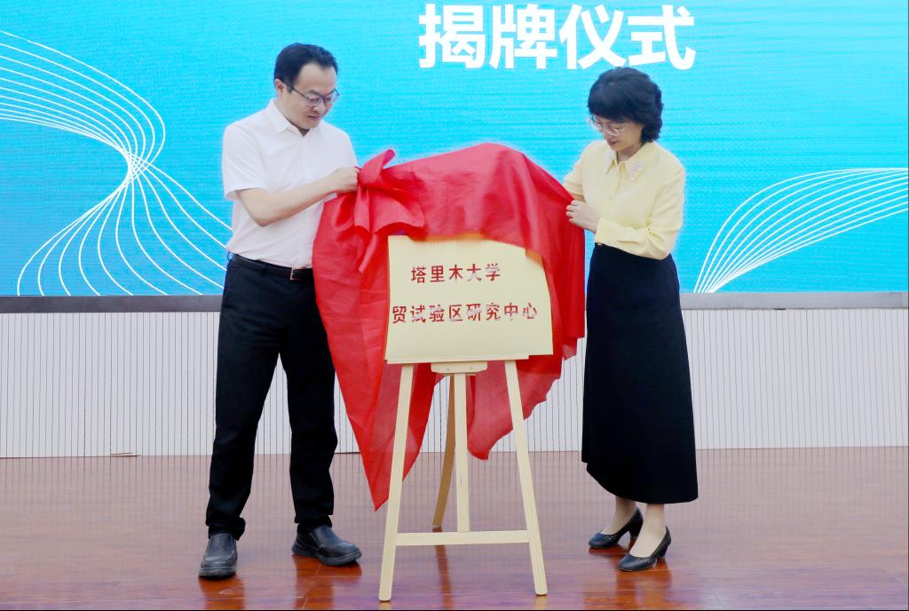 开幕式上,张爱萍、王旭阳共同为塔里木大学自贸试验区研究中心揭牌。塔里木大学经济与管理学院党委委员、副院长李博介绍了塔里木大学自贸试验研究中心建设情况。