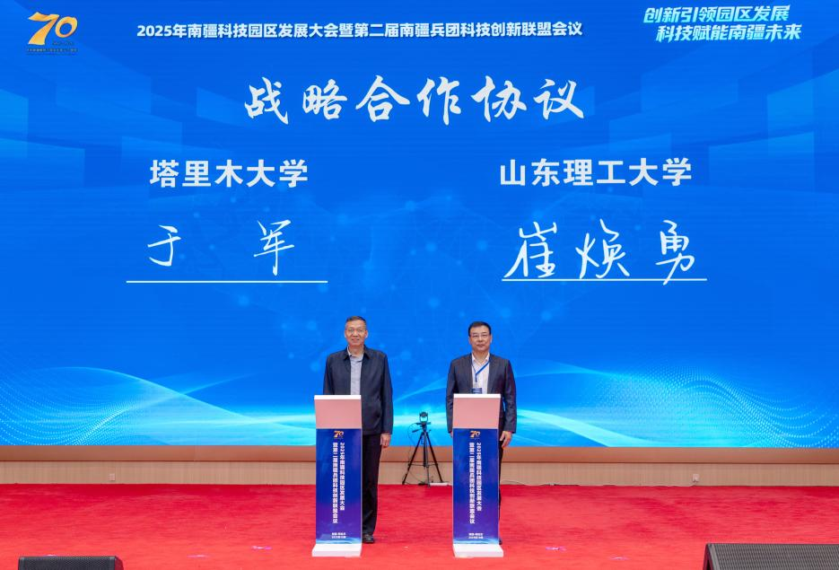 于军、崔焕勇分别代表塔里木大学、山东理工大学签订战略合作协议。唐龙、李志军分别代表新疆塔建三五九建工有限责任公司、塔里木大学签订《科威特沙漠治理造林项目一造林优化模式筛选及生态效益评估项目合作协议》。张康虎、张洪硕、游超瑜、龚晓锐分别代表洁丽雅家居股份有限公司、大连理工大学、塔里木大学、塔里木协同创新研究院签订《兵团新疆棉全产业链绿色染整加工技术创新中心创建协议》。吕志军、张剑分别代表塔里木大学机械电气化工程学院、阿拉尔市阿新纺织有限公司签订《优质低耗紧密纺全流程智能化定制系统关键技术研究与应用示范项目合作协议》。李洪涛、高山分别代表阿阿高新区阿拉尔园区、塔里木大学南疆技术转移中心签订战略合作框架协议。