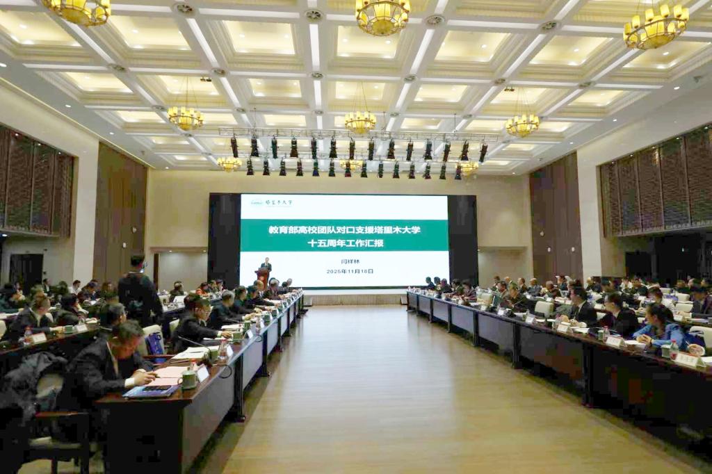 塔里木大学校长闫祥林从奋进十五年——对口支援成效与经验,擘画新蓝图——“十五五”发展目标,携手再出发——精准施援、靶向发力等方面,作了教育部高校团队对口支援塔里木大学十五周年工作汇报。