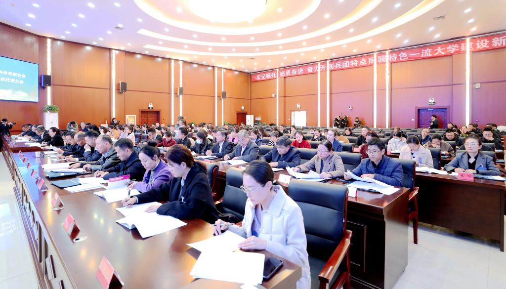 张爱萍讲话,感谢自治区社科联和兵团党委宣传部对学校哲学社会科学工作的关心和支持。她指出,在中华人民共和国成立76周年、自治区成立70周年、“十四五”规划收官、“十五五”规划开篇的关键时刻召开此次大会,恰逢其时,意义深远。希望学校社科联和全体社科工作者举旗定向、把牢政治之“舵”,服务大局、锻造决策之“库”,扎根人民、恪守为民之“本”,立德树人、夯实育人之“基”,秉持家国情怀、勇攀学术之“峰”,着力建设国家亟需、特色鲜明、制度创新、引领发展的高端智库,加快构建植根兵团实践、彰显南疆特色、服务稳定发展的哲学社会科学学科体系、学术体系和话语体系,在服务兵团和南疆发展的广阔天地中书写学术华章,为谱写中国式现代化新疆篇章、兵团篇章作出新的更大贡献。