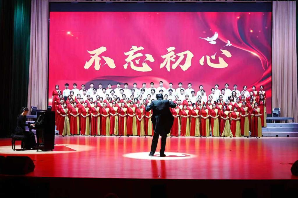 演出在合唱《不忘初心》中拉开帷幕,厚重的旋律,真挚的歌声,唱响了胡杨师生对初心与信念的坚守。