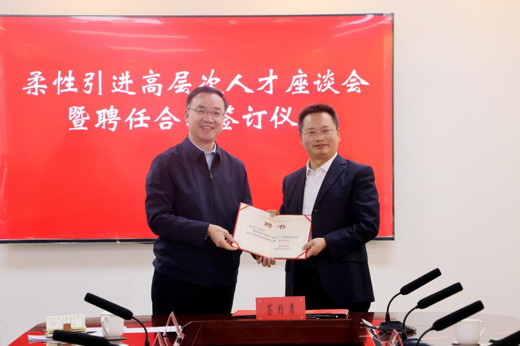 闫祥林为程运江教授颁发了聘书,感谢程运江教授对学校工作的支持,希望程运江教授依托华农资源,发挥个人专业优势,在学科建设、人才引进、校企融合等方面提供指导帮助,助力学校学科建设发展,以一流学科建设引领一流大学建设。