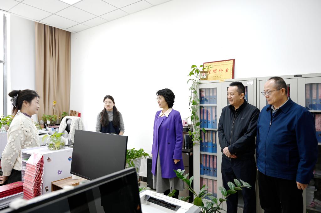 张爱萍走进各办公室,与部门负责同志、一线工作人员亲切交谈,详细了解学生返校上课、思想政治教育、心理健康教育、就业指导帮扶、日常管理服务等各项工作开展情况。叮嘱学生管理部门要提高政治站位,强化安全意识,加大关爱教育,用心用情用力做好学生教育管理工作。要创新工作方法,创新活动载体,用好“四个课堂”,切实提升思政教育的针对性实效性,扎实推进思政教育高质量发展。要一体推进招生就业工作,提前谋划招生工作,持续做好访企拓岗,举办好春季系列专场招聘会,多措并举拓宽就业渠道,精准推送就业信息,助力毕业生高质量充分就业。要强化联动协作,统筹抓好研究生思政引领、考研招录、科研创新、导师管理、学位点建设等工作。
