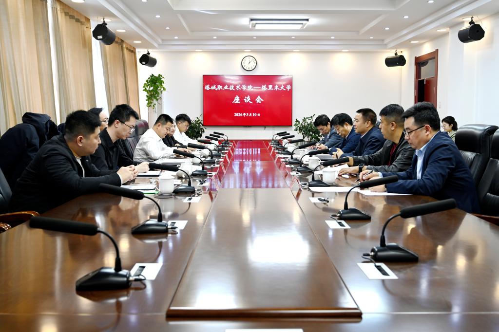 3月10日上午,塔城职业技术学院党委副书记、院长吴星霖一行来校交流,与我校党委副书记、校长闫祥林,党委常委、副校长张宏荣等领导,在行政楼四号洽谈室进行深入交谈。