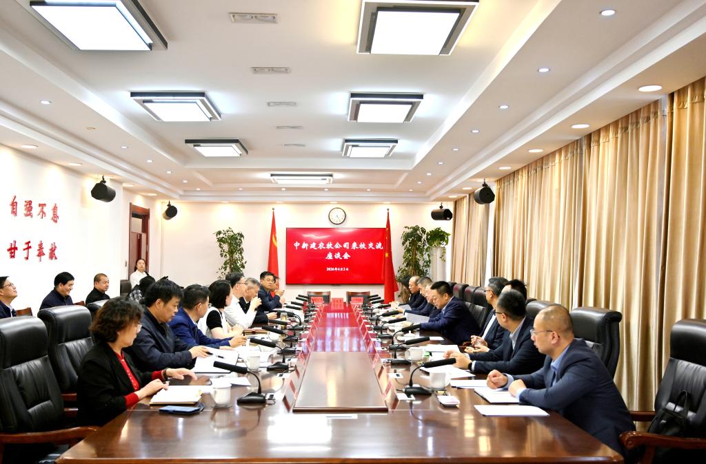 4月2日,中新建农牧公司党委书记、董事长张杰,党委委员、副总经理李兵一行来校交流,与我校党委书记张爱萍,党委副书记、校长闫祥林,党委副书记于军等领导,在行政楼四号洽谈室,进行深入座谈。