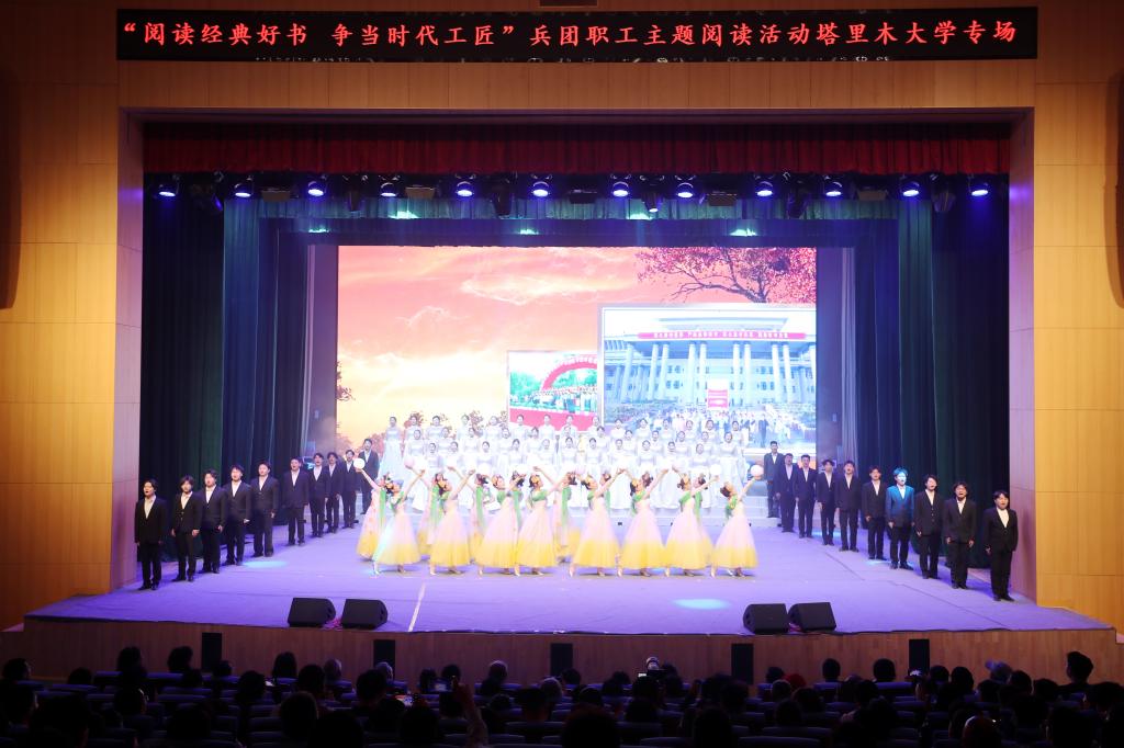 兵团广播电视台著名主持人李秋玲主持,第一师阿拉尔市党委常委、副政委、宣传部部长马荣华,兵团总工会党组成员、副主席董友斌,塔里木大学党委副书记、副校长林松涛,党委副书记、副校长、宣传部部长王成涛,中国工人出版社西北片区负责人李明明,兵团总工会宣教部副部长钱欣臣等领导,与各师市与企业工会负责同志、劳模工匠代表、一师阿拉尔市职工代表,托云牧歌演职人员,塔里木大学有关部门、学院领导,师生代表近千人参加。(文/焦语涵 摄/赵建博 魏钰橦 黄颖柔 赵祥 贺惟)