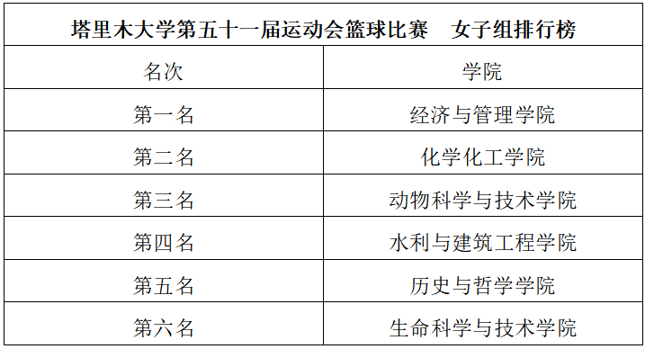 4月12日,塔里木大学第五十一届运动会篮球比赛在综合体育馆圆满结束。最终,农学院男子篮球队、经济与管理学院女子篮球队分别获得男篮、女篮冠军。