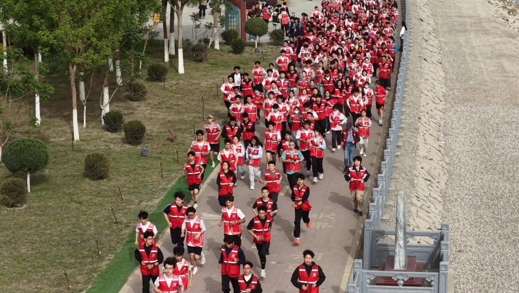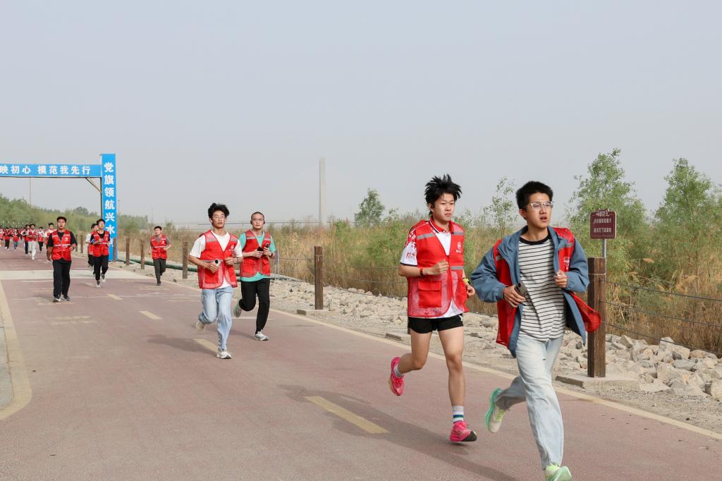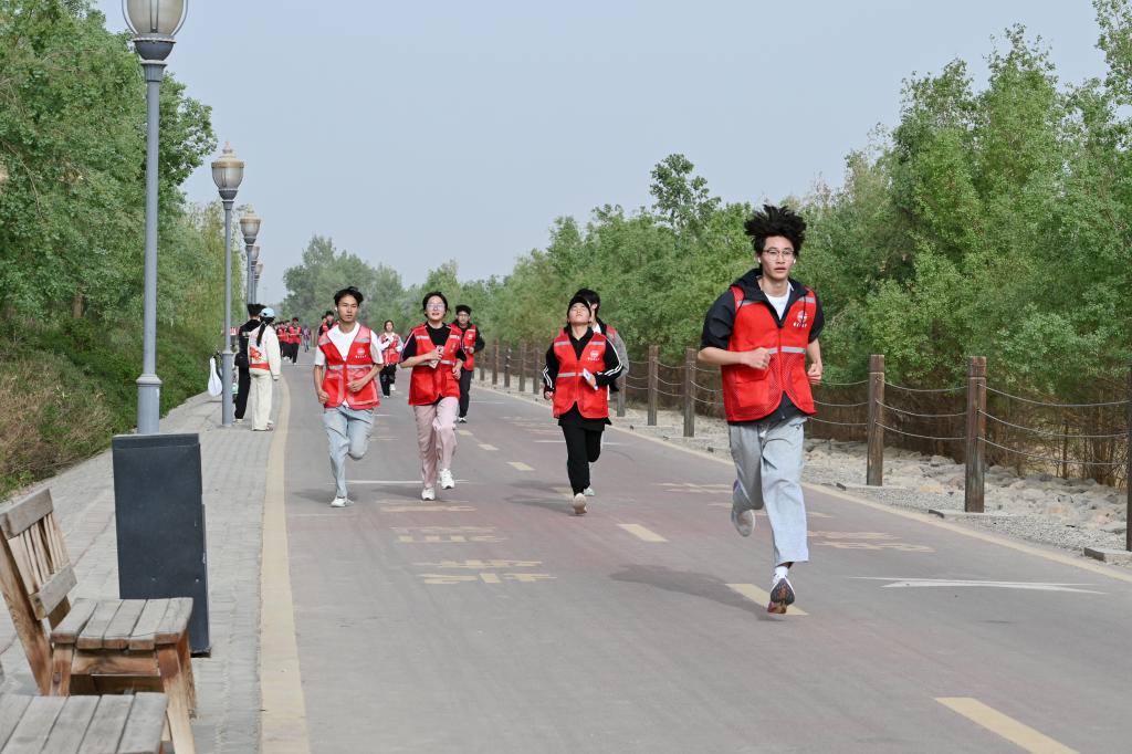 春日的塔里木河畔绿意萌发,风里裹挟着新生草木的清香气。赛道上,师生们身着轻便运动装,或奋力迈步比拼速度,或结伴慢跑欣赏沿途风光,在奔跑中欣赏暮春的景致。