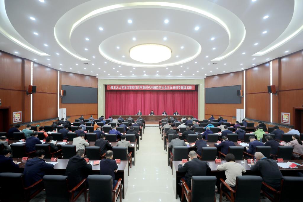 于军宣读了塔里木大学深入学习贯彻习近平新时代中国特色社会主义思想主题教育读书班实施方案。(文/王星原 摄/张英 谢学成)