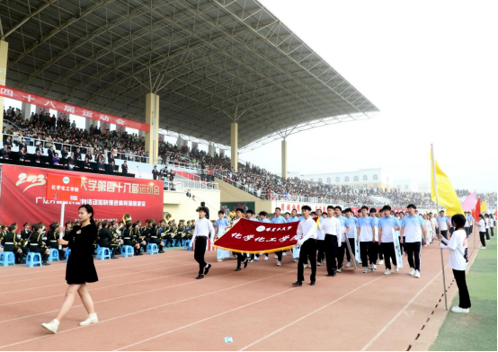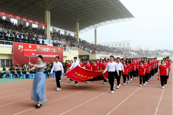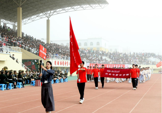 当我在追光,我与光同航。入场式开始,国旗方队、校旗方队、彩旗方队精神抖擞、气宇轩昂;裁判员代表队、研究生代表队、各学院代表队身着特色的服装、喊着嘹亮的口号,踏着整齐的步伐,依次通过主席台,展现了蓬勃的朝气和昂扬的风貌。