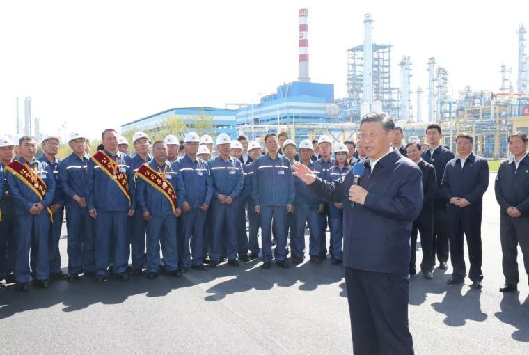 ↑2018年9月27日上午,中共中央总书记、国家主席、中央军委主席习近平在辽宁中国石油辽阳石化公司同工人亲切交流。新华社记者 鞠鹏 摄