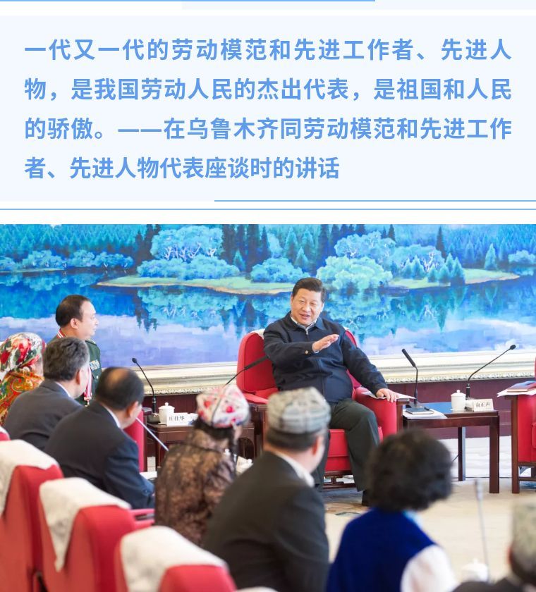 ↑2014年4月30日上午,习近平在乌鲁木齐同劳动模范和先进工作者、先进人物代表座谈。新华社记者 谢环驰 摄