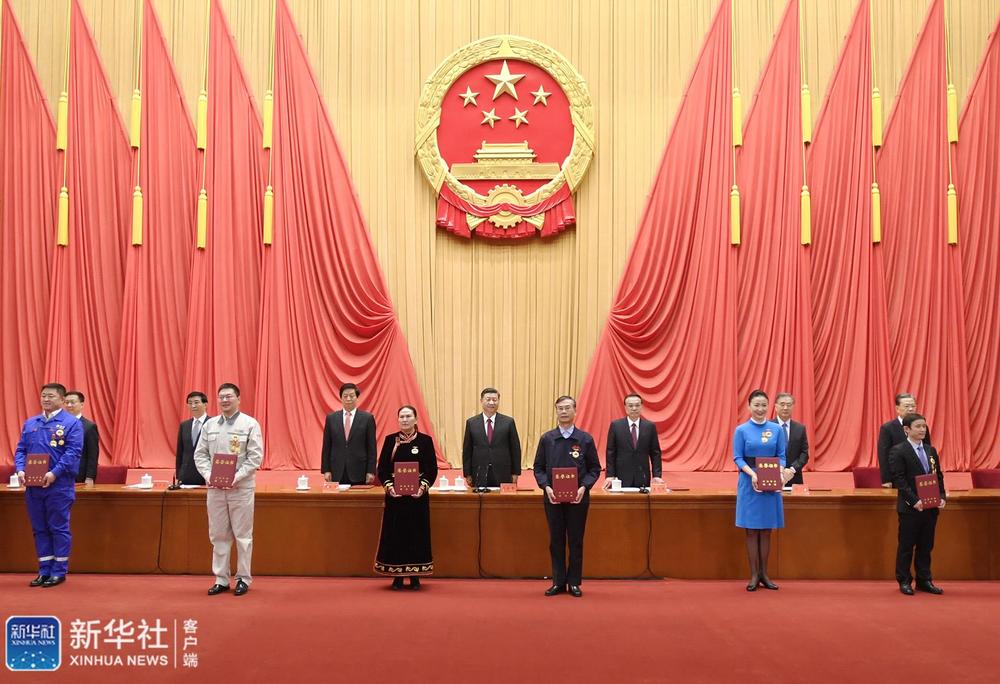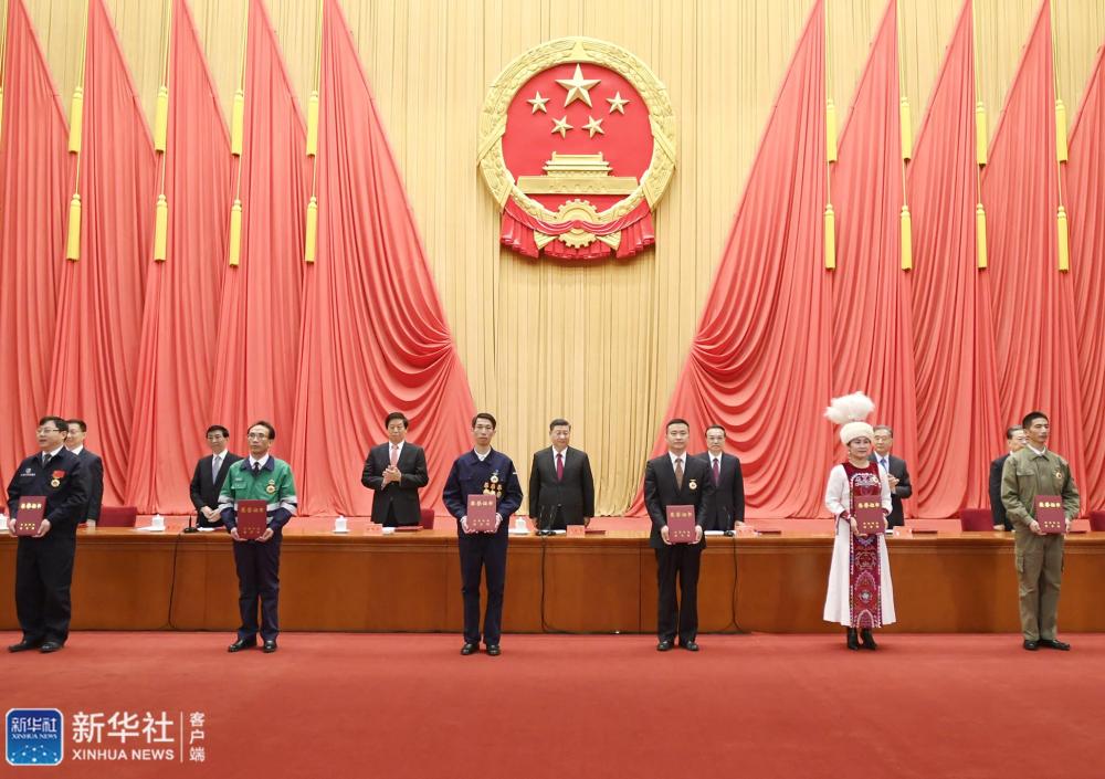 ↑11月24日,全国劳动模范和先进工作者表彰大会在北京人民大会堂隆重举行。这是习近平等党和国家领导人向全国劳动模范和先进工作者代表颁发荣誉证书。新华社记者 谢环驰 摄