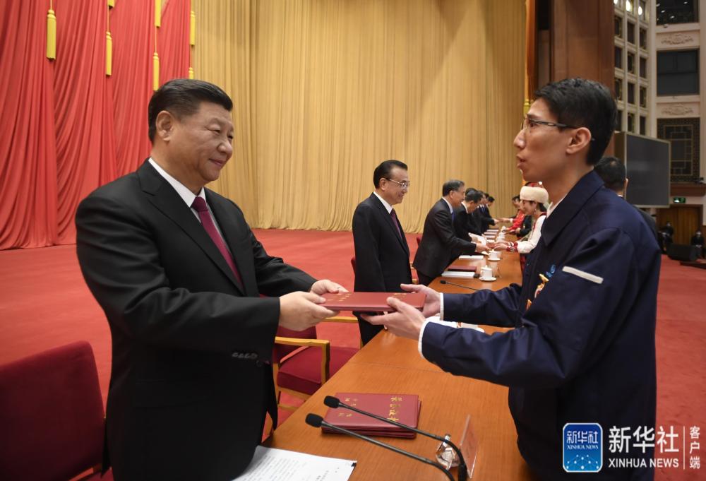 在欢快的乐曲声中,全国劳动模范和先进工作者代表依次登上主席台,习近平等为他们颁发荣誉证书。